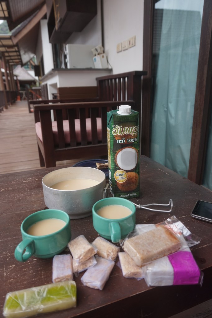 I takhle může vypadat snídaně…čaj s kokosovým mlékem s místními sladkými pochutinami.