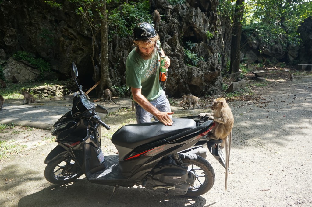 Byli na organizovaným výletě na James Bond Islandu a udělali si dokonce i vícedenní výlet do Krabi, jak jinak než na skůtru (na něm strávili 98 % svého času a ježdění dovedli k dokonalosti, když si vozili prdele i na market 10 m od jejich ubytování). Na cestě do Krabi se hecli a i přes bolest jejich pozadí ujeli za den krásných 186 km. S nápadem půjčit si skůtra přišel D. a nutno podotknout, že nápad oba hodnotí, jako jeho nejlepší nápad ever. Zaprvé je to šíleně bavilo – provoz je tu v podstatě nekontrolovatelný, na přednosti v jízdě se nehraje, značení chybí, silnice ovládají skůtři a skůtřice, kteří se dokážou narvat do nenarvutelného, řidič tu musí být dravý a to D. splňuje bez výjimky. Nezastaví je ani déšť (mají pláštěnky) či setmění. A za druhé je to nejideálnější způsob, jak se tu pohybovat – s výstavbou chodníků si tu nelámou hlavu a procházky u čtyřproudovky vyměnili za dvojnohého oře. A tím jsem vlastně zodpověděla i Tvoji otázku Babu.“