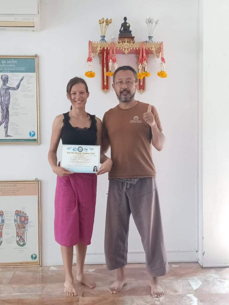 To je pravda. Mě se na kurzu mj. líbil právě ten jiný přístup, než s kterým jsem se setkala na jakémkoliv jiném kurzu masáží v Evropě. Každé ráno se začínalo modlitbou k doktoru Shivagu Komarapajovi. Thajci věří, že dr. Shivago (přezdívka) vede jejich ruce při samotné masáži. Věří, že masér je pouze zprostředkovatelem Shivagova učení, jeho energie, záměrů atd. Při samotné modlitbě není dovoleno, aby chodidla směřovala čelem k dalšímu člověku (soše reprezentující člověka), takže i při modlitbě se sedí na podlaze s nohama pokrčenýma bokem. Při masáži se dbá na to, aby masér masáž vykonával pouze v dobrém rozpoložení, relaxovaný, bez spěchu. V thajské masáži jde totiž o ovlivňování toků životní energie. Masíruje se na tzv. sénách, pomyslných energetických čarách (obdoba u nás známějších meridiánů), kde se tlakem ovlivňují akupunkturní body.