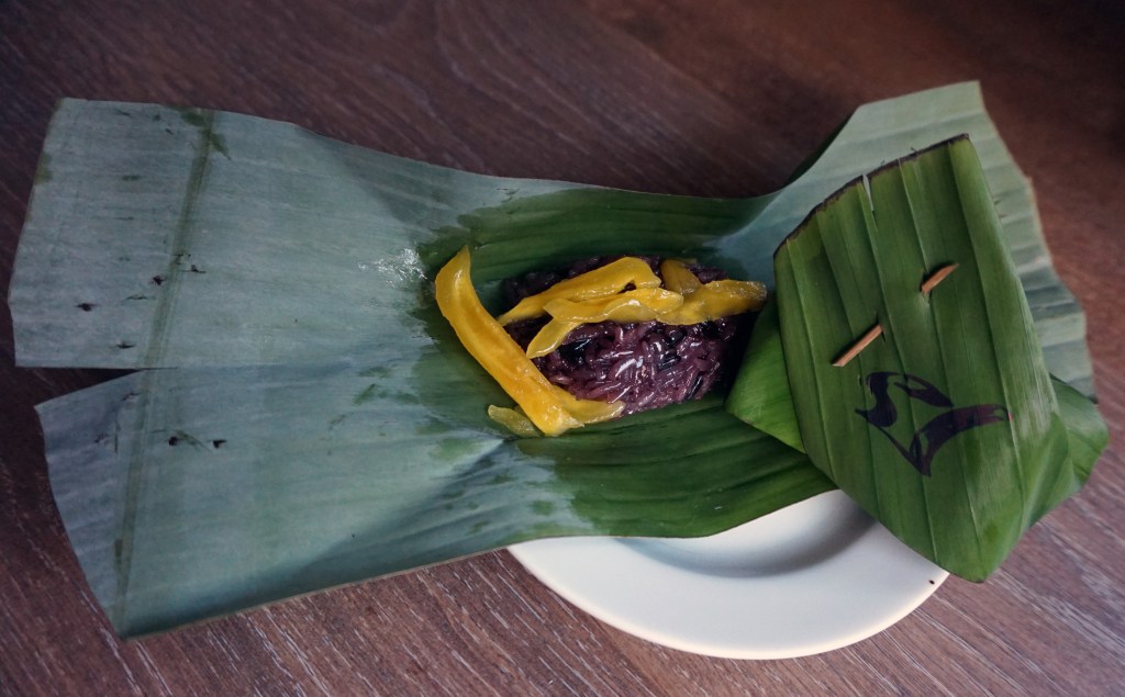 Sladké překvapení (mango sticky rise) v banánovém listu.