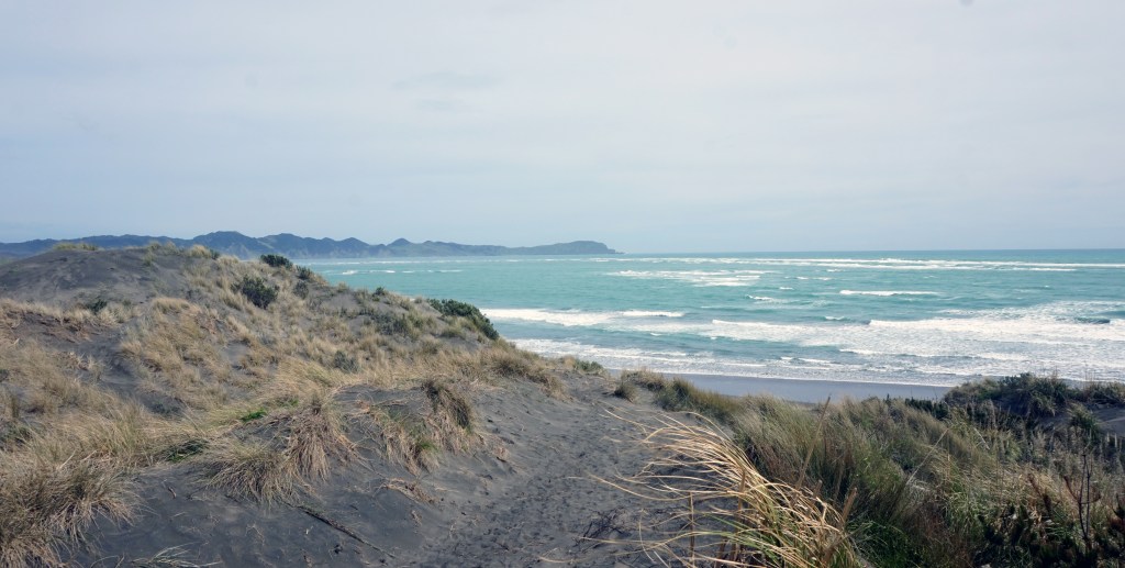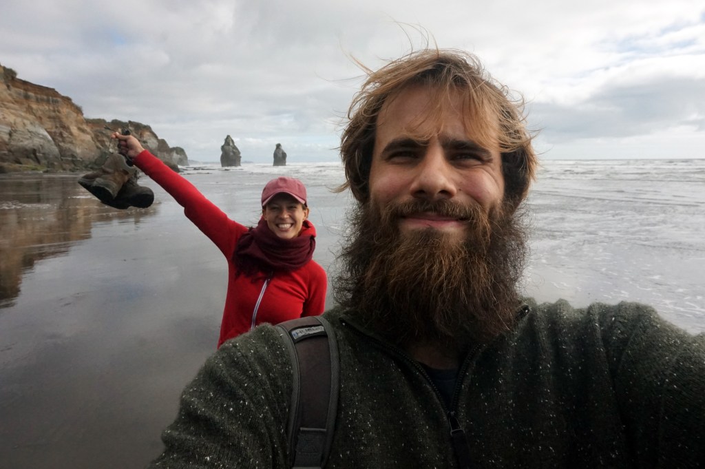 Následujícího dne jsme jeli na pláž s teplými prameny (Ocean Beach Hot Springs) za městečkem Kawhia. Pláž byla úchvatná. Blyštila se jako černej drahokam (černý sopečný písek) s nafialovělým nádechem (viníkem grafit). Jednalo se o magnetickou pláž, kdy se po přiložení magnetu k písku, magnet obalil „železným“ pískem.
