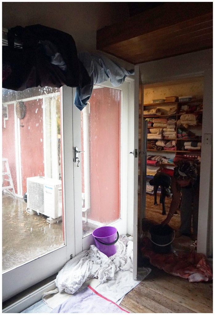 Odpoledne nás zastihne slušnej slejvák. Během pár minut vytvoří regulérní vodopád dopadající až k nám do pokojíčku, voda prosakuje v mnoha částech domu, který je nyní již 70 let starý.