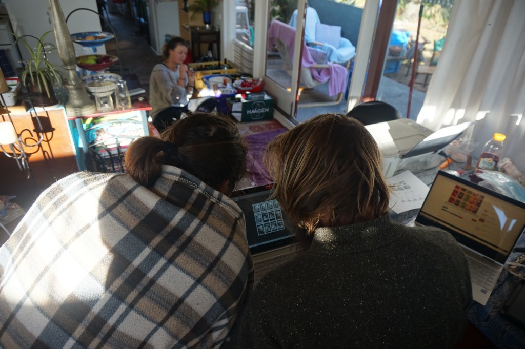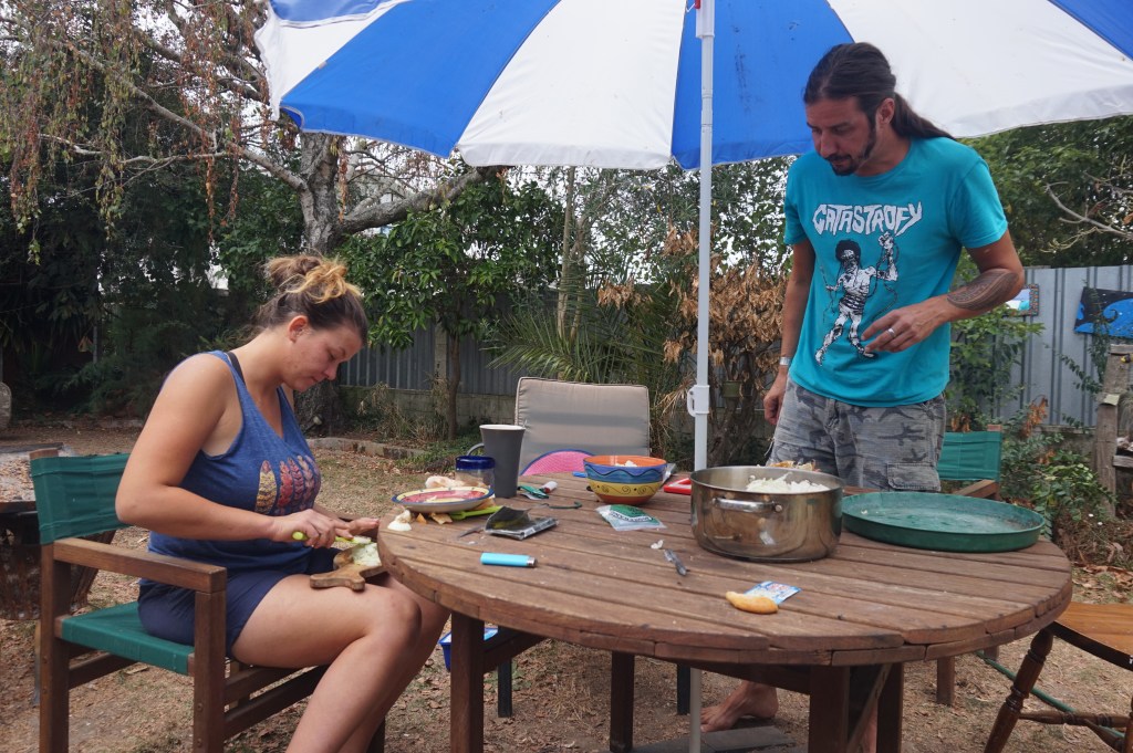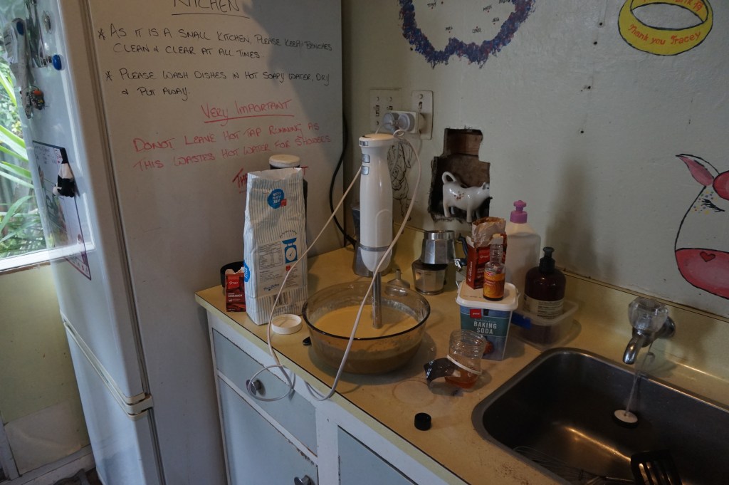 Kuchyně je těžce vytížená, doslova o sebe zakopáváme. Vaří se v podstatě všude, na každém volném centimetru, který jsme schopni pro sebe v domečku ukořistit.